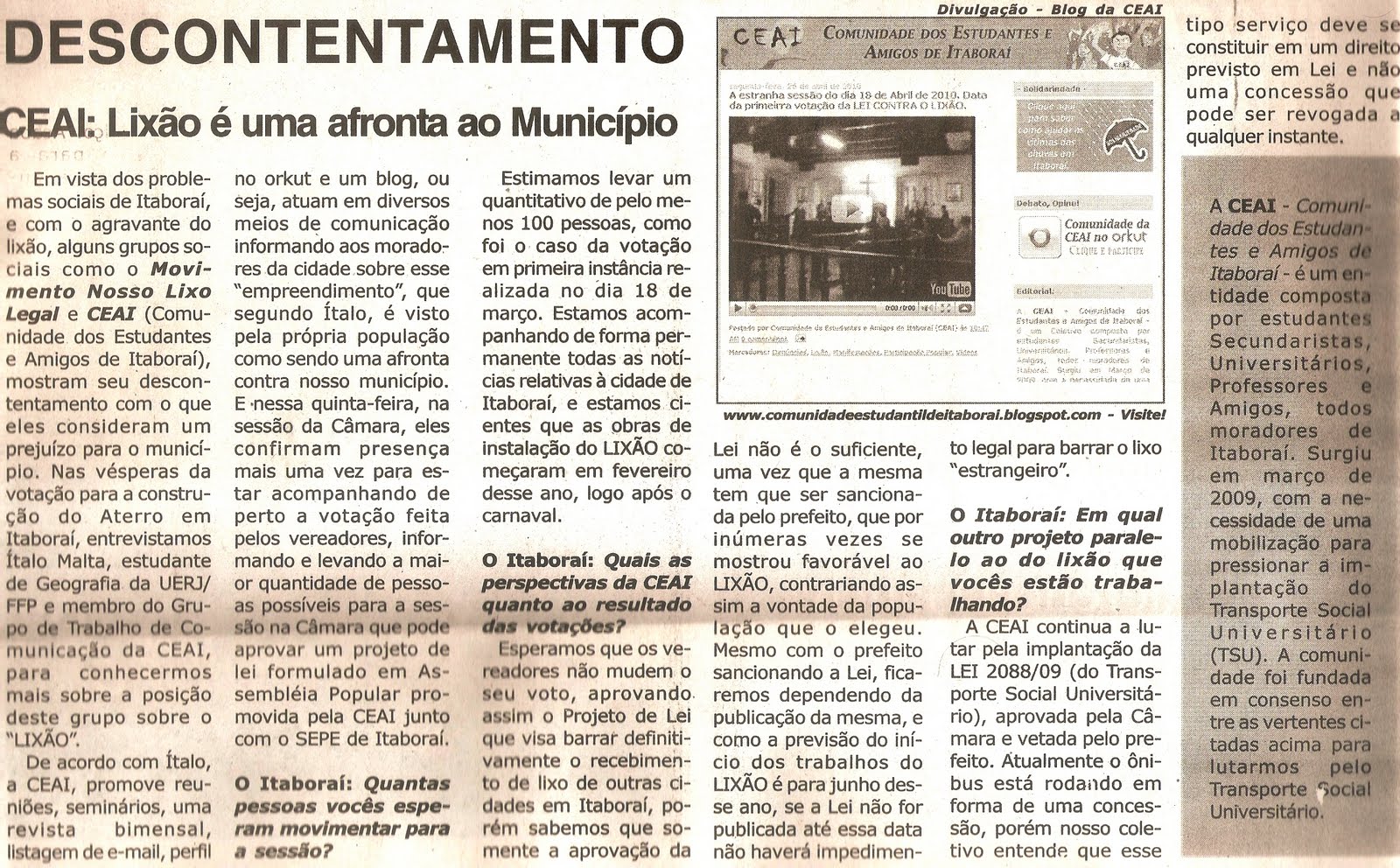 A CEAI vem atuando contra o LIXÃO de forma permanente, promovendo reuniões, seminários, uma revista bimensal, listagem de e-mail, perfil no orkut e um blog, ou seja, todos os meios de comunicação possível para levar a população de Itaboraí informações sobre esse "empreendimento" visto pela própria população como sendo uma afronta contra nosso município.