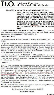 Portanto, é verdade, Itaboraí já havia recebido de “presente” um LIXÃO que já está em funcionamento e que chegará a receber 5.000 toneladas de lixo por dia, recebe agora de “presente” um presídio, que no decreto recebe o pomposo nome de Centro de Socioeducação da Região do Grande Rio.